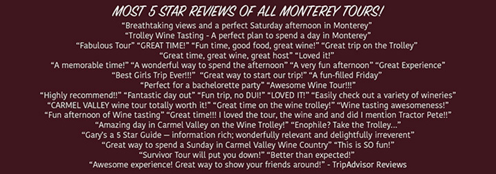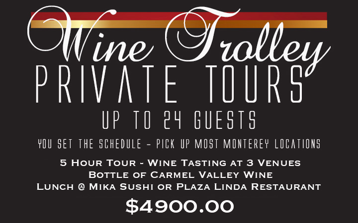 Seating for LUNCH is available all during the tour. Come on in when you're hungry. Please try to enjoy your lunch by 2:30, as the tour departs at 3:30. Our 15 passenger vans are used on more private tours when we have 9 participants or less. No food, ice chests or coolers are permitted on our vehicles other than the foods provided by Tours Monterey unless previously arranged. No cancellations or refunds on any tour. Service fees at a rate of 4% will be added to all credit card orders processed over the phone. 15% Gratuity added to all parties of 10 or more. We are not responsible for hours of operation of wine tasting rooms. Please no one under 21.